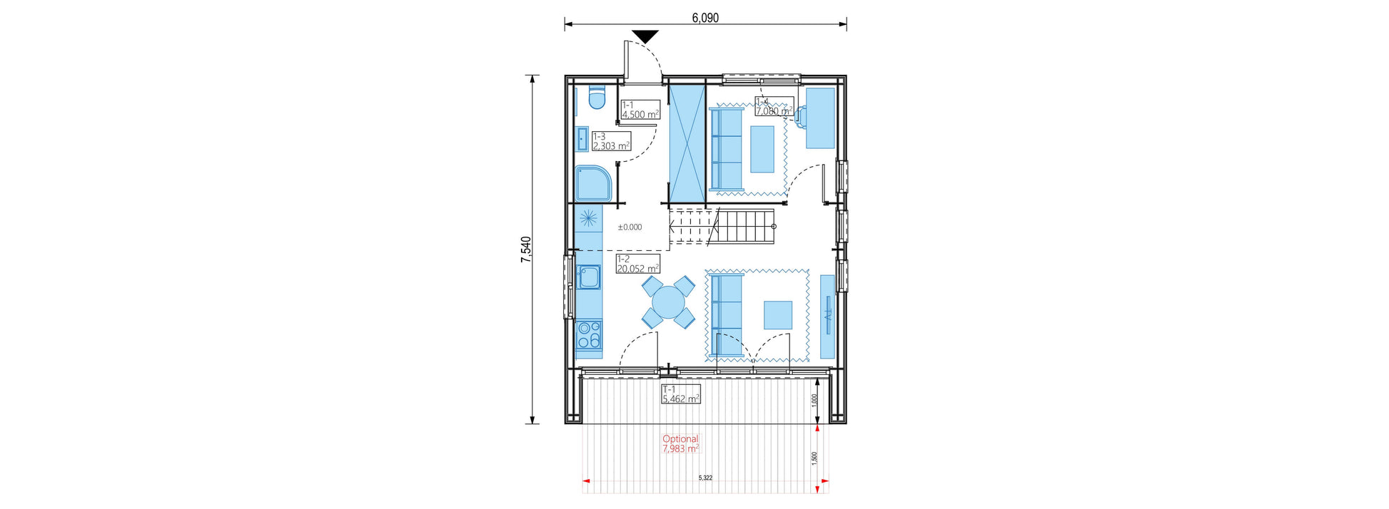 Extras opcionales: tratamiento interior, contraventanas, contrapuertas, puertas y ventanas de PVC, persianas para puertas y ventanas de PVC, tejado de panel de sándwich, cámara de aire en cubierta (doble techo), aislamiento en suelo, extra de altura.